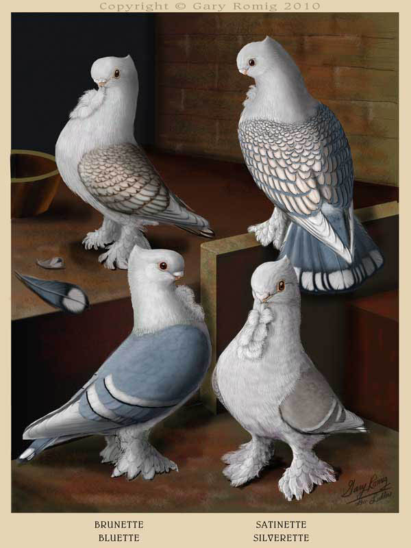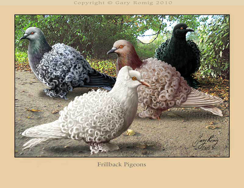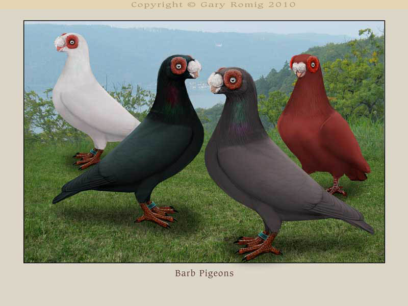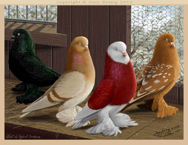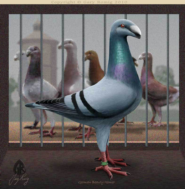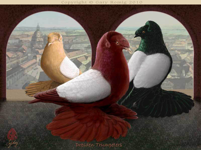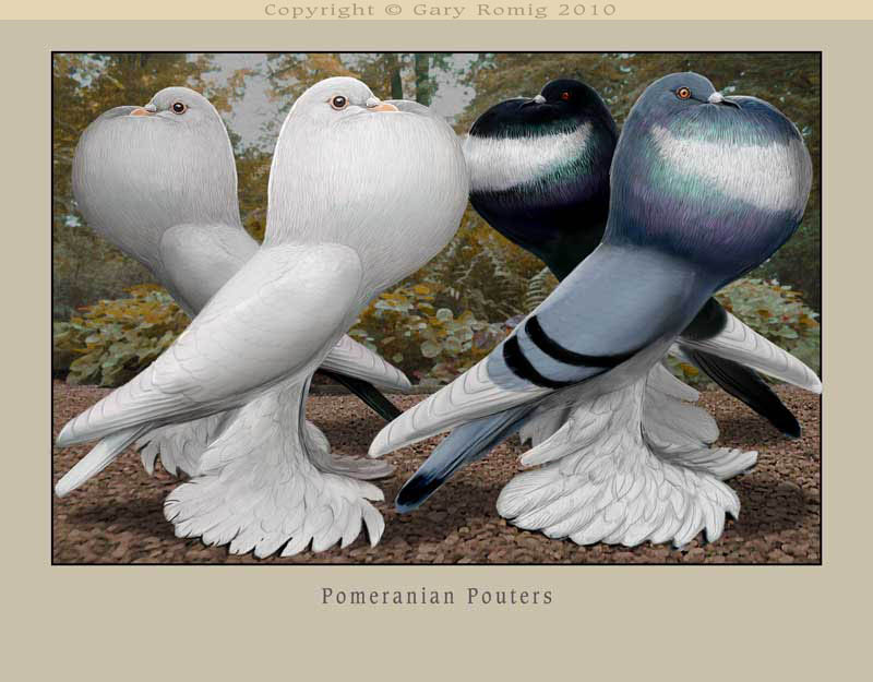 On the right are clickable fields which represent the main pigeon group catagories. Within these catagories are more indexes to art of pigeons. I will be working to fill each catagory with more art in the coming years. The catagories are taken from systems used in Europe but are modified by me. I hope this helps you to find the breed you are looking for. I may, in the future, add more catagories or change the location of some breeds. I am open to suggestions on how to divide the pigeon types into more functional catagories. Now offering Greeting Cards Contact Gary Romig: |